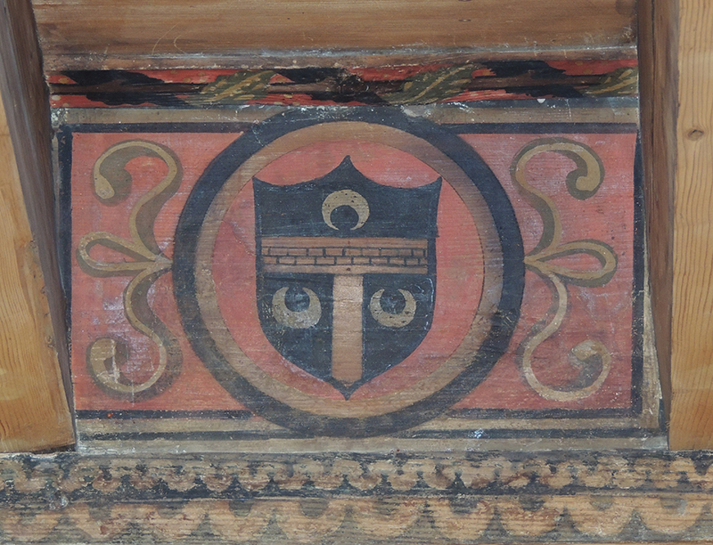 Tavoletta da soffitto realizzata in legno di abete, dipinta a tempera direttamente sul supporto privo di preparazione, ma semplicemente impermeabilizzato con una stesura di colla probabilmente di origine animale. All'interno di una circonferenza è posto lo stemma Gugliola su scudo alla veneta. Il tutto è inserito all'interno di una cornice rettangolare.