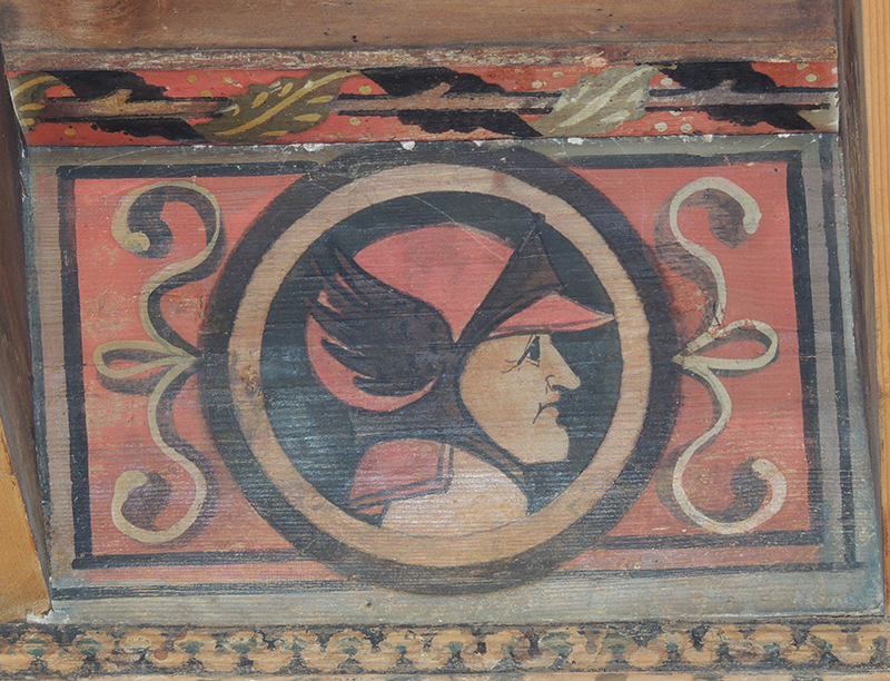Tavoletta da soffitto realizzata in legno di abete, dipinta a tempera direttamente sul supporto privo di preparazione, ma semplicemente impermeabilizzato con una stesura di colla probabilmente di origine animale. All'interno di una circonferenza è posto un volto maschile di profilo. Il tutto è inserito all'interno di una cornice rettangolare.