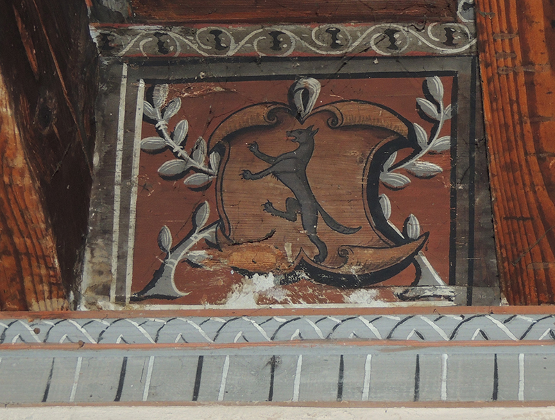 Tavoletta da soffitto realizzata in legno di abete, dipinta a tempera direttamente sul supporto privo di preparazione, ma semplicemente impermeabilizzato con una stesura di colla probabilmente di origine animale. All'interno di una semplice cornice lineare e su fondo rosso è posto lo stemma Valvasone inserito su scudo sagomato.