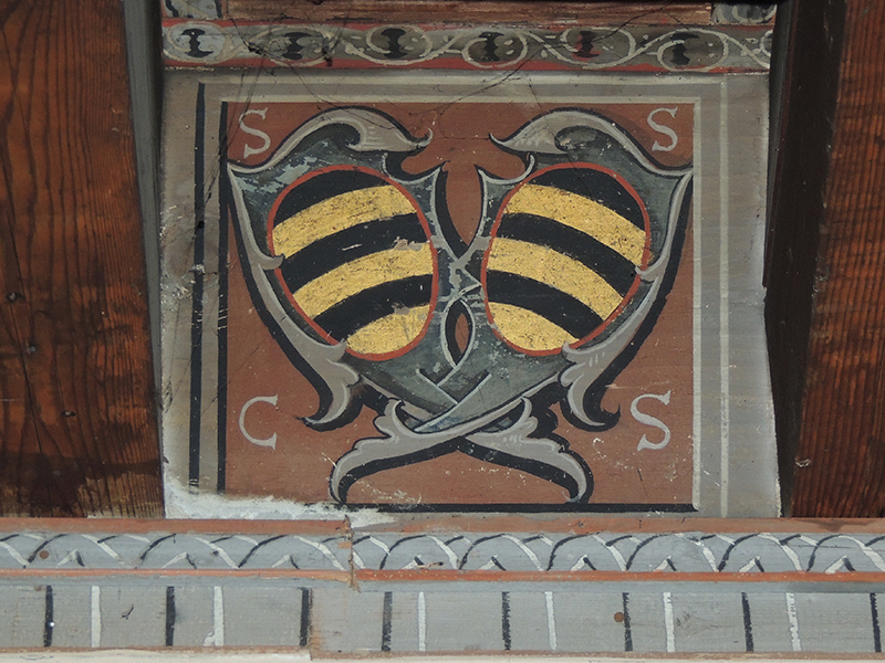 Tavoletta da soffitto realizzata in legno di abete, dipinta a tempera direttamente sul supporto privo di preparazione, ma semplicemente impermeabilizzato con una stesura di colla probabilmente di origine animale. All'interno di una semplice cornice lineare e su fondo rosso è posto lo stemma matrimoniale relativo all'unione tra Soldoniero e Cornelia di Strassoldo.