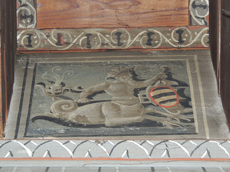 Tavoletta da soffitto realizzata in legno di abete, dipinta a tempera direttamente sul supporto privo di preparazione, ma semplicemente impermeabilizzato con una stesura di colla probabilmente di origine animale. All'interno di una semplice cornice lineare e su fondo azzurro è posto un motivo decorativo costituito da un tritone che regge lo stemma Strassoldo.