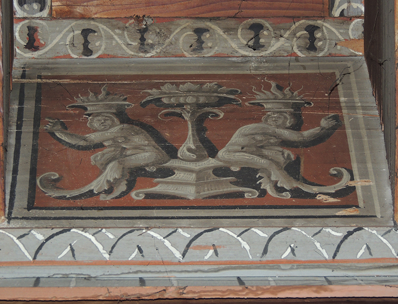 Tavoletta da soffitto realizzata in legno di abete, dipinta a tempera direttamente sul supporto privo di preparazione, ma semplicemente impermeabilizzato con una stesura di colla probabilmente di origine animale. All'interno di una semplice cornice lineare e su fondo rosso è posto un motivo decorativo costituito da un vaso ornamentale con grottesche.
