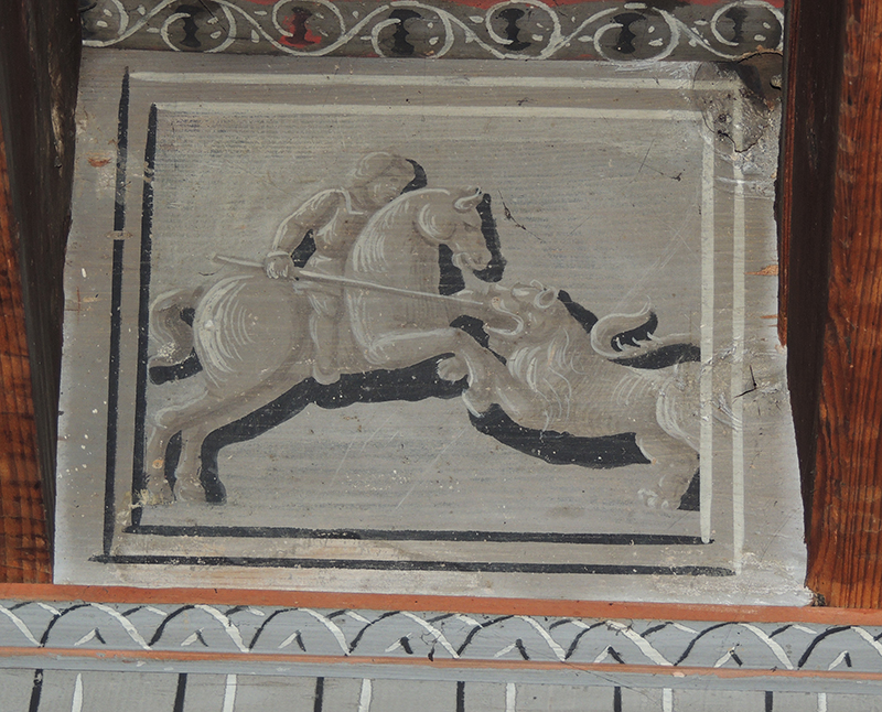 Tavoletta da soffitto realizzata in legno di abete, dipinta a tempera direttamente sul supporto privo di preparazione, ma semplicemente impermeabilizzato con una stesura di colla probabilmente di origine animale. All'interno di una semplice cornice lineare e su fondo azzurro è dipinto un cavaliere con lancia che uccide un leone.