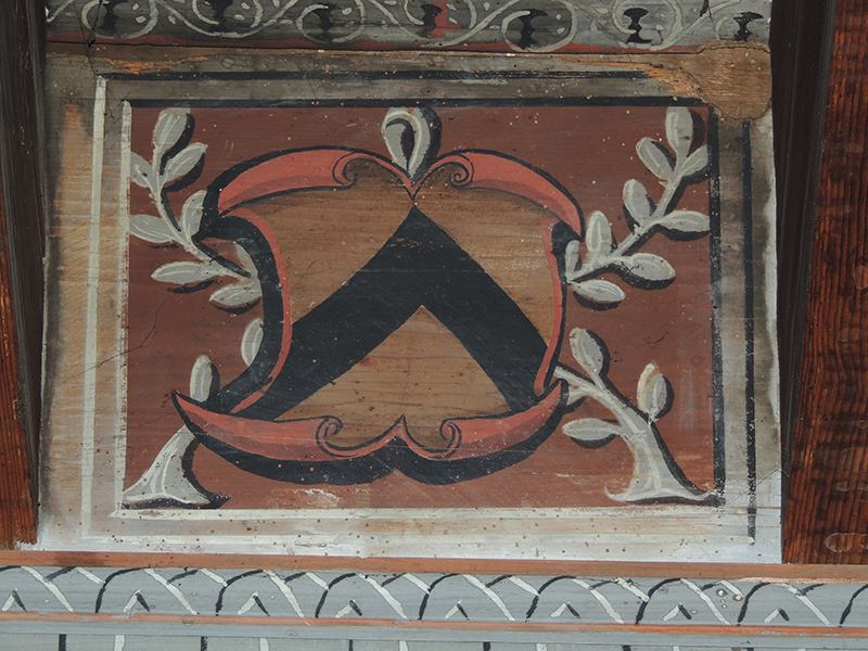 Tavoletta da soffitto realizzata in legno di abete, dipinta a tempera direttamente sul supporto privo di preparazione, ma semplicemente impermeabilizzato con una stesura di colla probabilmente di origine animale. All'interno di una semplice cornice lineare e su fondo rosso è posto lo stemma Savorgnan inserito su scudo sagomato.