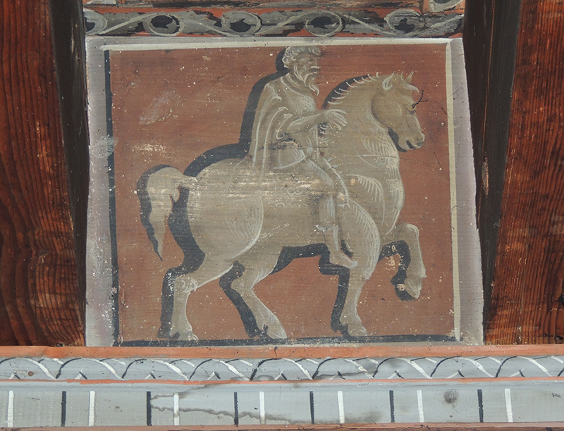 Tavoletta da soffitto realizzata in legno di abete, dipinta a tempera direttamente sul supporto privo di preparazione, ma semplicemente impermeabilizzato con una stesura di colla probabilmente di origine animale. All'interno di una semplice cornice lineare e su fondo rosso è dipinta con l'ausilio di una mascherina la statua equestre di Marco Aurelio.