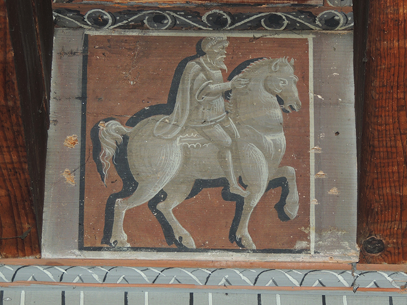 Tavoletta da soffitto realizzata in legno di abete, dipinta a tempera direttamente sul supporto privo di preparazione, ma semplicemente impermeabilizzato con una stesura di colla probabilmente di origine animale. All'interno di una semplice cornice lineare e su fondo rosso è dipinta con l'ausilio di una mascherina la statua equestre di Marco Aurelio.