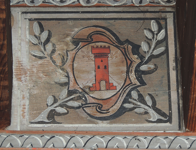 Tavoletta da soffitto realizzata in legno di abete, dipinta a tempera direttamente sul supporto privo di preparazione, ma semplicemente impermeabilizzato con una stesura di colla probabilmente di origine animale. All'interno di una semplice cornice lineare e su fondo azzurro è posto lo stemma della Torre inserito su scudo sagomato.