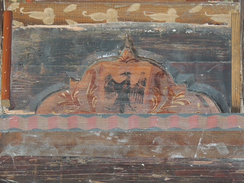Tavoletta da soffitto realizzata in legno di abete, dipinta a tempera direttamente sul supporto privo di preparazione, ma semplicemente impermeabilizzato con una stesura di colla probabilmente di origine animale. Impermeabilizzazione della superficie e dipintura sono limitate allo spazio circoscritto da un arco trilobo, mentre, nella parte esterna a esso, la tavoletta è lasciata ‘al naturale’. All'interno dell'arco trilobo è posto uno scudo appuntato con lo stemma Coltrari. Ai fianchi e al di sopra dello scudo vi è una decorazione floreale costituita da ampi fiori.