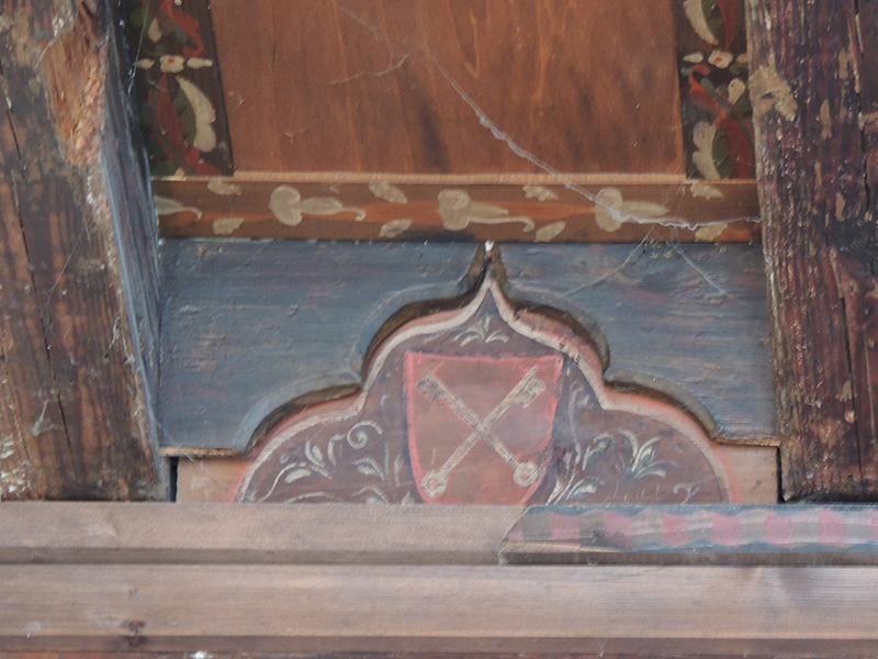 Tavoletta da soffitto realizzata in legno di abete, dipinta a tempera direttamente sul supporto privo di preparazione, ma semplicemente impermeabilizzato con una stesura di colla probabilmente di origine animale. Impermeabilizzazione della superficie e dipintura sono limitate allo spazio circoscritto da un arco trilobo, mentre, nella parte esterna a esso, la tavoletta è lasciata ‘al naturale’. All'interno dell'arco trilobo è posto uno scudo appuntato con lo stemma de Egregiis. Ai fianchi e al di sopra dello scudo vi è una decorazione floreale costituita da ampi fiori.