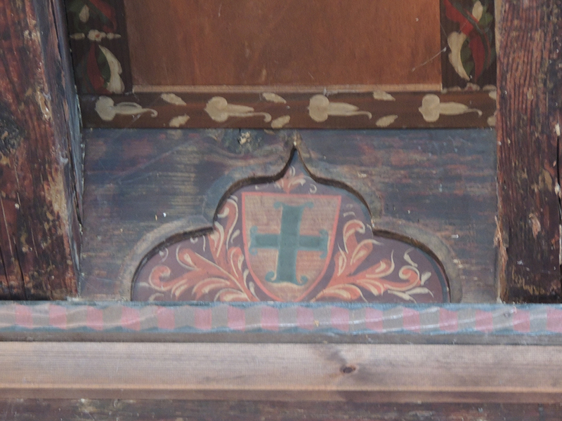 Tavoletta da soffitto realizzata in legno di abete, dipinta a tempera direttamente sul supporto privo di preparazione, ma semplicemente impermeabilizzato con una stesura di colla probabilmente di origine animale. Impermeabilizzazione della superficie e dipintura sono limitate allo spazio circoscritto da un arco trilobo, mentre, nella parte esterna a esso, la tavoletta è lasciata ‘al naturale’. All'interno dell'arco trilobo è posto uno scudo appuntato con uno stemma che non è stato possibile individuare. Ai fianchi e al di sopra dello scudo vi è una decorazione floreale costituita da ampi fiori.