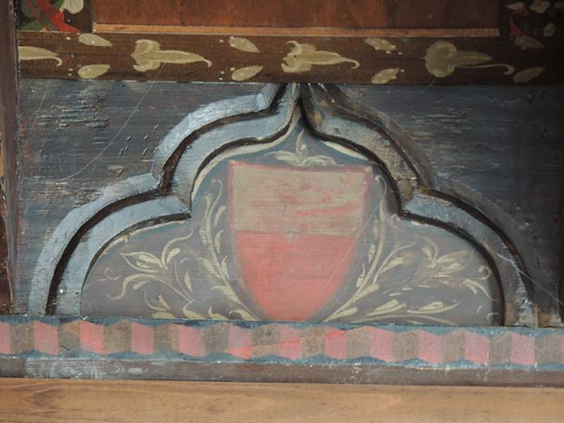 Tavoletta da soffitto realizzata in legno di abete, dipinta a tempera direttamente sul supporto privo di preparazione, ma semplicemente impermeabilizzato con una stesura di colla probabilmente di origine animale. Impermeabilizzazione della superficie e dipintura sono limitate allo spazio circoscritto da un arco trilobo, mentre, nella parte esterna a esso, la tavoletta è lasciata ‘al naturale’. All'interno dell'arco trilobo è posto uno scudo appuntato con lo stemma Terzi. Ai fianchi e al di sopra dello scudo vi è una decorazione floreale costituita da ampi fiori.