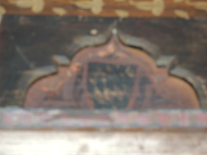 Tavoletta da soffitto realizzata in legno di abete, dipinta a tempera direttamente sul supporto privo di preparazione, ma semplicemente impermeabilizzato con una stesura di colla probabilmente di origine animale. Impermeabilizzazione della superficie e dipintura sono limitate allo spazio circoscritto da un arco trilobo, mentre, nella parte esterna a esso, la tavoletta è lasciata ‘al naturale’. All'interno dell'arco trilobo è posto uno scudo appuntato con uno stemma che non è stato possibile individuare. Ai fianchi e al di sopra dello scudo vi è una decorazione floreale costituita da ampi fiori.