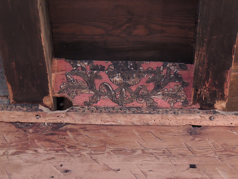 Tavoletta da soffitto realizzata in legno di abete, dipinta a tempera direttamente sul supporto privo di preparazione, ma semplicemente impermeabilizzato con una stesura di colla probabilmente di origine animale. La decorazione è costituita da racemi vegetali.