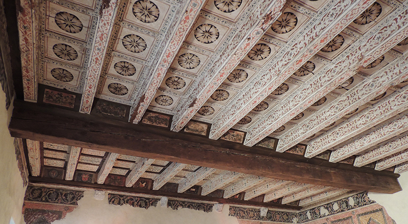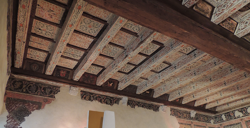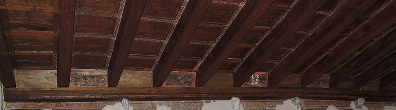 Il soffitto è il risultato di una ricomposizione – attuata in epoca recente e in seguito a lavori di ristrutturazione che hanno coinvolto l’intero edificio – di nuclei diversi. Le differenze nelle tipologie decorative impiegate fanno pensare che le pettenelle possano provenire da almeno due, se non tre, ambienti diversi. A un primo ambiente potrebbero appartenere le pettenelle con lo stemma Bisetti su scudo ‘a testa di cavallo’ e quelle con la seconda tipologia di decoro vegetale, soluzioni che ricordano quelle impiegate per il soffitto di palazzo Pisenti Stringher a Cividale del Friuli. A un secondo soffitto potrebbero essere riferite, invece, le tavolette con gli stemmi Sbroiavacca e Bisetti (quest’ultimo su scudo ‘da torneo’) e quelle con la prima tipologia di decoro vegetale.