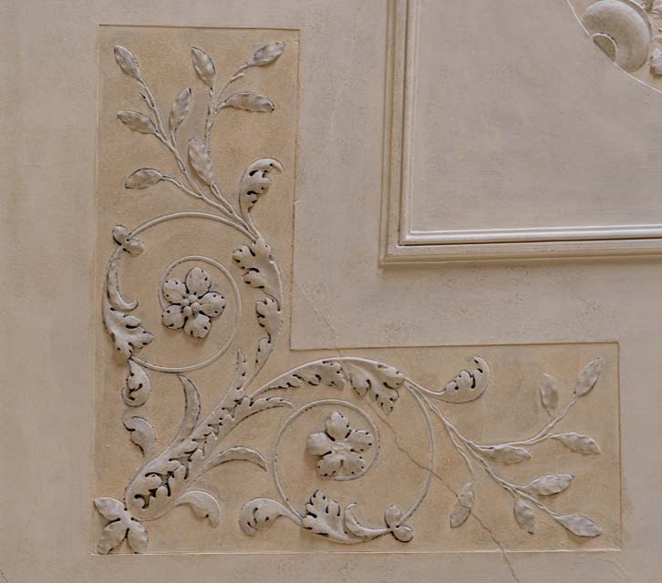 La stanza di piccole dimensioni ad uso ufficio presenta una decorazione sulle pareti e sul soffitto realizzata in rilievo a stucco bianco su ampie quadrature colorate di ocra. Lungo la parte bassa delle pareti corre una finta pannellatura rosa, parzialmente rovinata. Su una parete corta è invece presente un’ampia quadratura color ocra, la quale accoglie in alto ghirlande floreali in rilievo bianco. Il soffitto presenta una quadratura centrale delimitata da una cornice in rilievo bianco, mentre una fascia esterna segue il perimetro del soffitto presentando agli angoli un decoro in rilievo con girali vegetali e fiori e lungo i lati lunghi piccole composizioni in rilievo di strumenti musicali (flauti e tamburi).