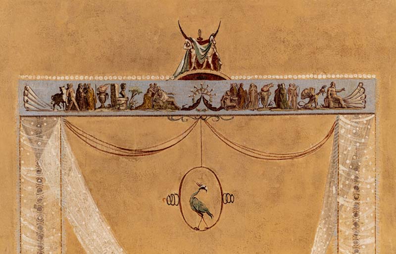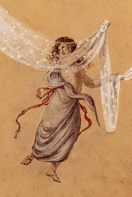 La quadratura risulta incorniciata da una fascia monocroma di colore abbellita da un motivo decorativo ripetuto. All’interno una figura femminile seminuda e avvolta in un drappo viola con nastri rossi danza giocando con una tenda bianca semi trasparente che drappeggia dall’alto, appesa ad un fregio decorato con figure e vasi, insieme ad un medaglione ornato da un uccello.