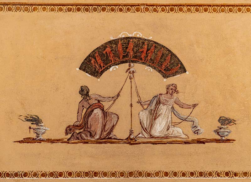 Sopra la porta è presente una quadratura monocroma, incorniciata da una fascia di colore arancione e da un motivo geometrico ripetuto. All’interno sono raffigurate due figure femminili in abiti dal gusto classico secondo una moda della prima metà dell’Ottocento, le quali inginocchiate giocano con delle corse appese ad un paravento nero ornato da figure rosse. Ai lati vi sono due vasi con fiaccole.