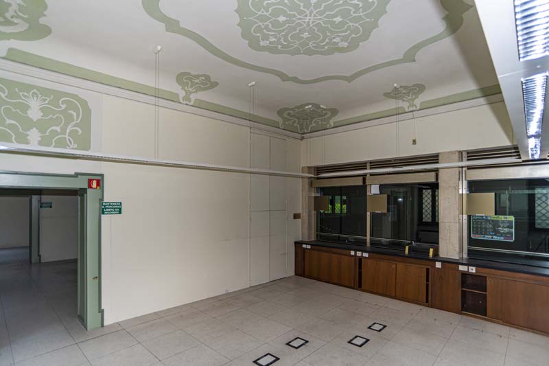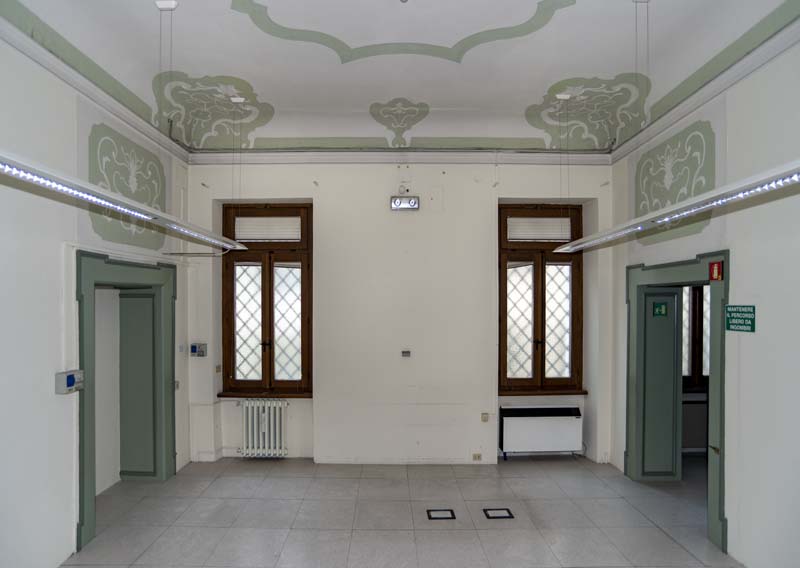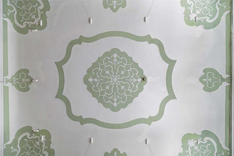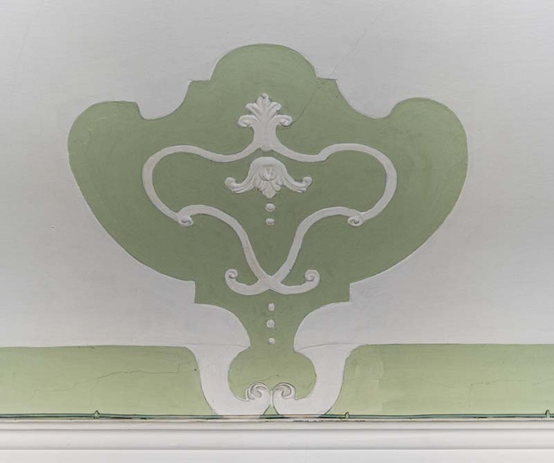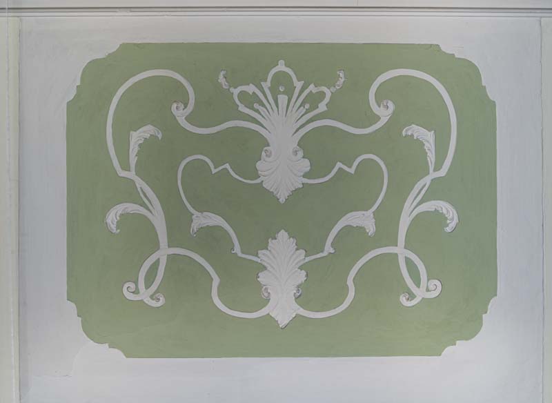Le pareti e il soffitto della stanza mostrano una decorazione, conservatasi solo parzialmente, sui toni del verde e del bianco. Il soffitto dipinto di bianco, delimitato da un fregio in rilievo bianco e da una fascia di colore verde, accoglie forme mistilinee color verde su cui vi sono motivi decorativi in rilievo bianco con arabeschi e fogliami. Sopra le due porte vi sono due specchiature rettangolari verdi incorniciate di bianco e ornate al centro da un motivo ornamentale.