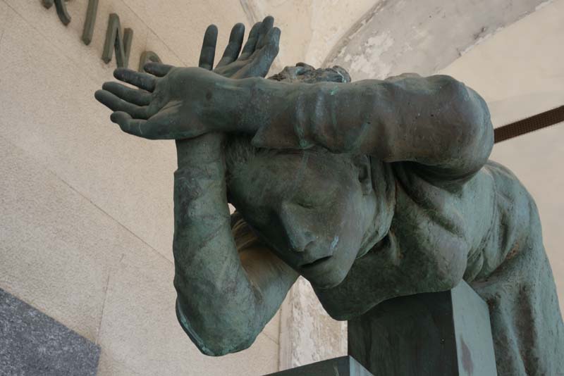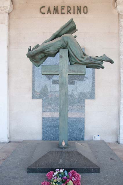 Gruppo scultoreo in bronzo composto da una grande croce alla sommità della quale è appoggiata sul ventre una figura femminile che porta le mani incrociate all'altezza della fronte e indossa una semplice veste lunga fino ai piedi, stretta in vita da una corda. Sulla parete di fondo è presente una croce realizzata con lastre in marmo verde.