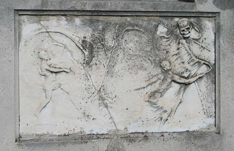 Due blocchi di pietra sagomati, decorati superiormente da croce a rilievo, affiancano la lastra di marmo arcuata con le iscrizioni. Nella parte inferiore della stele un rilievo rettangolare raffigura l'allegoria della Morte. Agli angoli della base rettangolare sono collocati quattro pilastrini in pietra terminanti con una croce a rilievo su ciascun lato - due accanto alla stele, due nella parte anteriore - sono collegati da due barre in ferro a delimitazione dei lati del monumento.