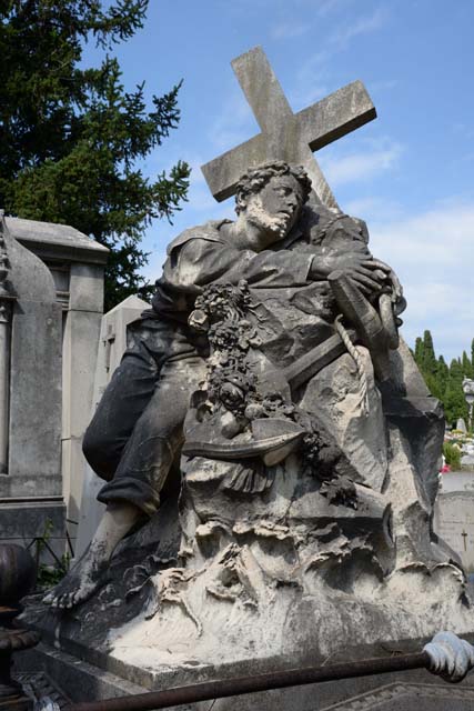 Su un basamento a tronco di piramide, decorato nel lato anteriore da una struttura frontonata, sopra un rialzo roccioso circondato dai flutti è visibile la statua di un naufrago abbracciato a una croce. Accanto alla figura sono appoggiati un'ancora e dei fiori. Il monumento è circondato da una semplice recinzione in ferro formata da quattro pilastrini angolari e da barre orizzontali.