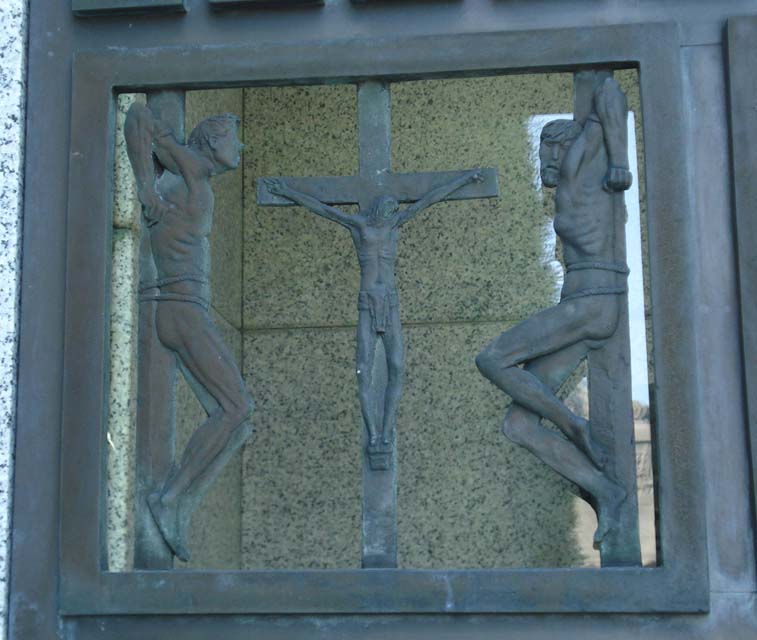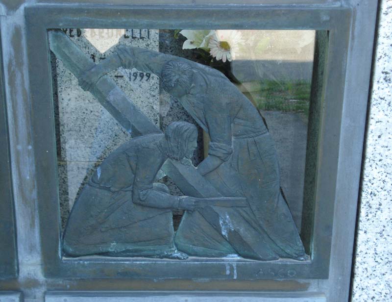 L'ingresso della cappella, costituita interamente da lastre di marmo, è chiuso da una porta in bronzo composta da sei formelle raffiguranti altrettante scene della vita di Cristo, dall'alto in basso e da sinistra verso destra: Crocifissione, Cristo deposto dalla croce, Cristo condannato a morte, Cristo incontra la Veronica, Natività di Gesù, Costruzione della croce. All'interno della cappella, sopra un alto basamento in marmo con iscrizioni, è il busto in bronzo di un defunto, forse Ettore Brunelli.