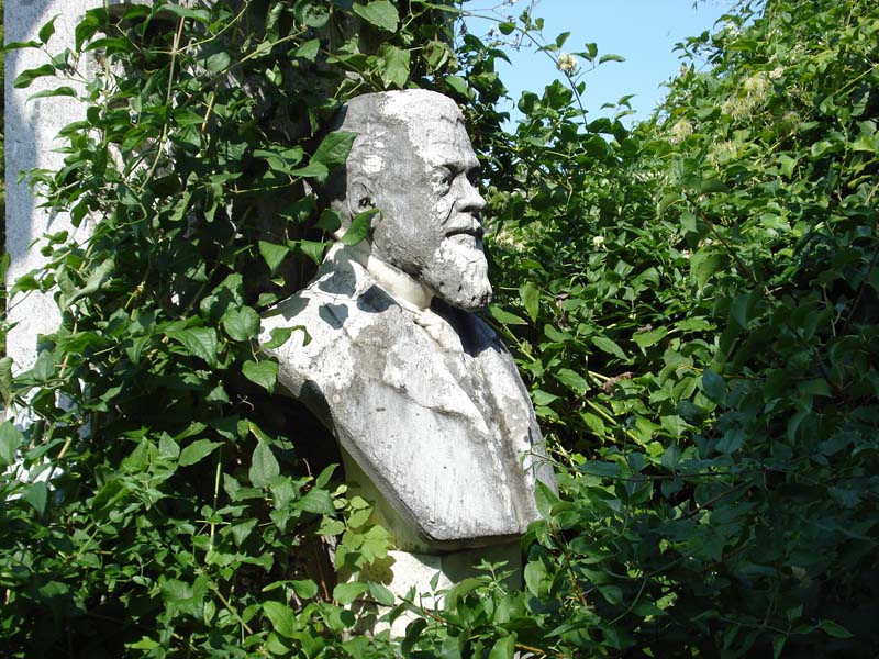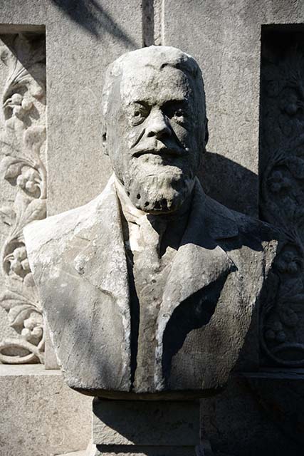 Sopra un basamento è posto il busto di un uomo anziano con barba e baffi vestito di giacca, camicia e cravatta. Alle sue spalle sorge una stele che, nella parte anteriore, assume la forma di una croce. Davanti, a terra, è posto un vaso parallelepipedo decorato da una croce greca in lamina di piombo. L'area è delimitata da barre in ferro fissate su pilastrini di pietra.