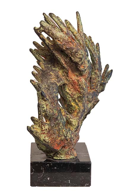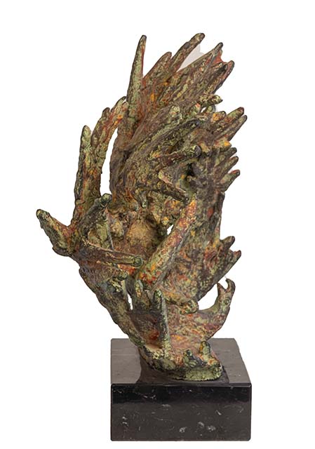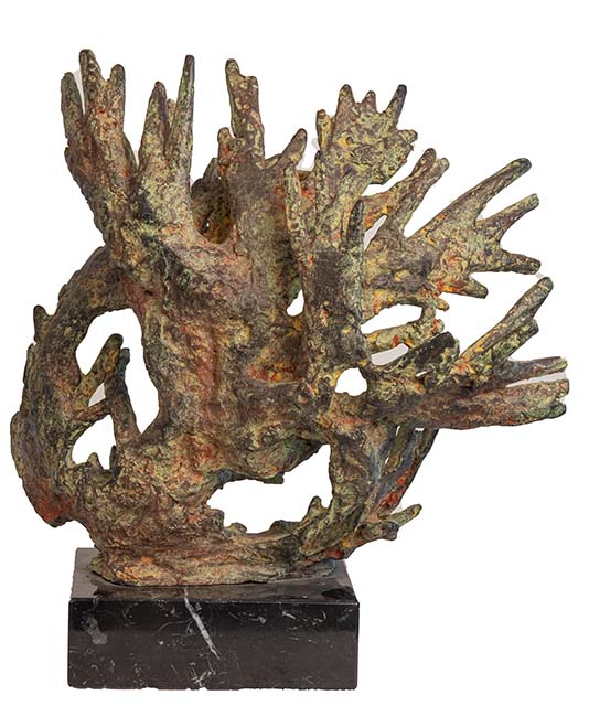 Due uccelli, probabilmente dei rapaci, lottano fra loro. La scultura è posta sopra una base in marmo.