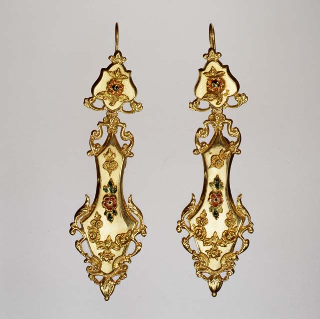 Orecchini di lamina d'oro 18 K con pendente a losanga incorniciato da volute. Sullo scudo superiore e sul pendente sono applicate, per mezzo di graffe, decorazioni floreali a stampo, alcune con smalti rosso e verde.