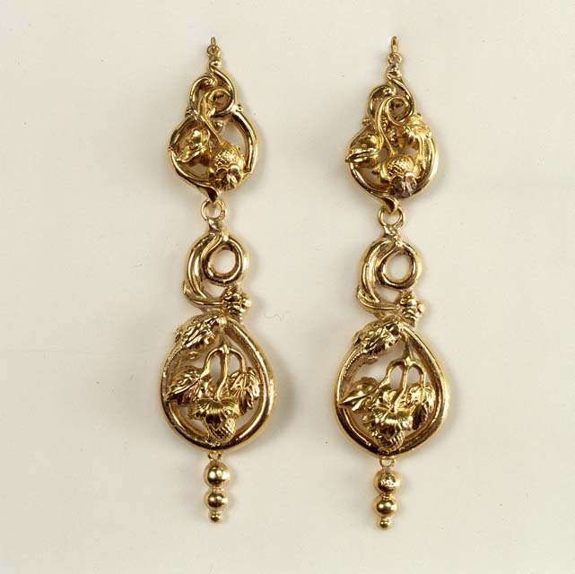 Orecchini in oro 18 K formati da una parte superiore e da un pendente, entrambi costituiti da un contorno a doppia lamina di sezione circolare che assume in alto l'aspetto di un ramo e di un serpente attorcigliato nel pendente. Motivo centrale a lamina singola, lavorata a stampo, raffigurante una melagrana nella parte superiore e in basso una fragola. In fondo al pendente è appeso un ciondolino con tre semisfere digradanti.