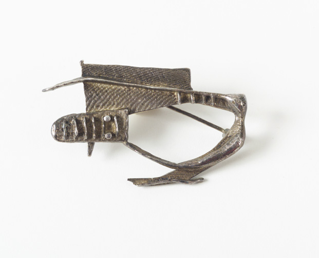 La spilla è stata ricavata da una fusione in argento da osso di seppia. La chiusura è ad ago. Dalle testimonianze dei familiari l'artista avrebbe eseguito altri gioielli al momento non rintracciti. La spilla è costituita da elementi geometrici simili a quelli incisi nei rilievi in gesso del periodo astratto del gruppo "2 x GO.