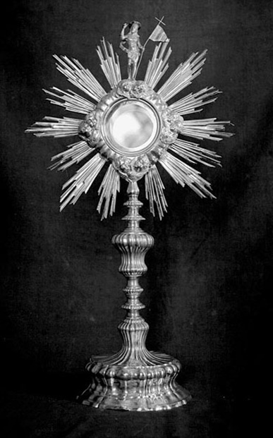 Piede sagomato con costolature verticali che proseguono lungo il fusto; due coppie di nodi schiacciati sono posizionati sotto e sopra il nodo principale a canestro. La teca è circondata da testine angeliche e da raggi luminosi. Il coronamento è costituito dalla figuretta di Cristo risorto.