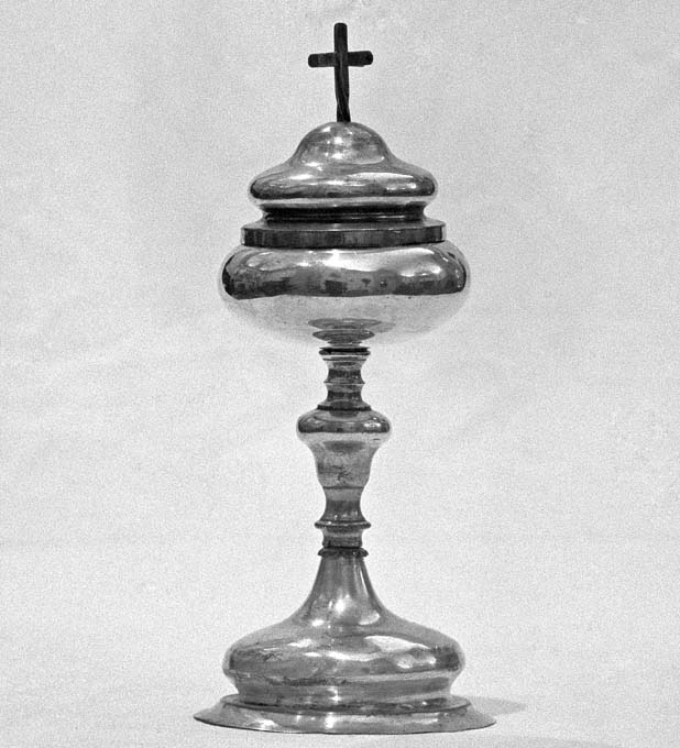 La pisside presenta piede bombato a base circolare, nodo piriforme liscio, coppa liscia a vaso espanso, chiusa da coperchio sagomato, sormontato da doppia crocetta apicale ritorta. La coppa è realizzata in argento e dorata internamente, gli altri elementi in ottone argentato.