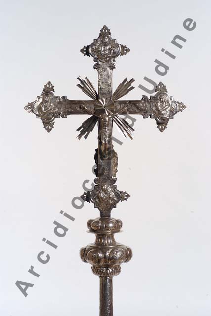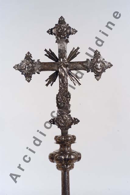 Su inesto cilindrico, ornato da lievi motivi di foglie d'acanto, s'inserisce il nodo a vaso schiacciato decorato a sbalzo. La croce con terminazioni polilobate è percorsa da sottili incisioni con motivo di foglie d'acanto.Sul recto, al centro, il Crocifisso e sulle terminazioni le figure sbalzate della Vergine e di San Giovanni dolenti e in alto e in basso San Giovanni evangelista e la Madalenna. Sul verso, al centro la Vergine e sulle terminazioni il Padre Eterno, e i simboli degli Evangelisti. Sul bordo della croce sono applicati fregi fusi e cesellati.
