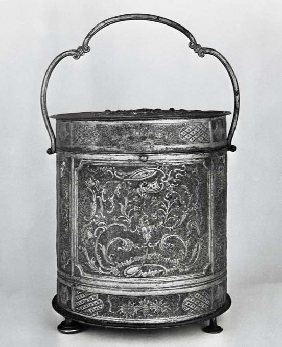 Secchiello di forma cilindrica poggiante su piedini a base circolare, con manico sagomato formato dall'unione di tre volute. Il corpo è suddiviso in riquadri maggiori e minori, entro i quali sono sbalzati motivi floreali, volute e scudi, compresi tra due fasce che mantengono analoga suddivisione e sono decorate da fiori e campiture geometriche riempite da una griglia di rombi o lisce. Sul coperchio è raffigurata la Madonna Assunta sospinta verso l'alto da angioletti e circondata da cherubini, racchiusa entro una campitura mistilinea delimitata da una cornice costituita da volute, arricciature e fiori, sormontata da una corona e affiancata da un cappello vescovile, sulla sinistra, e da un elmo e una spada a destra.