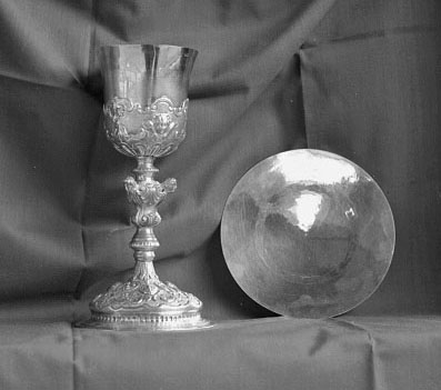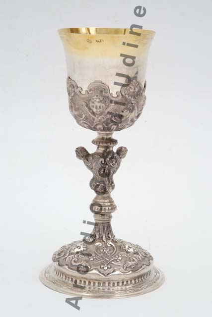 Il calice presenta piede a sezione circolare, con bordo piatto ornato da foglie correnti e corpo bombato nel quale tre testine alate sono inframezzate da motivi a nastro incrociati terminanti in volute lisce e vegetali. Il nodo sagomato del fusto è ornato da testine nascenti da volute, che ne percorrono tutta la lunghezza, separate da palmette. La coppa svasata, dorata all'interno e lungo il bordo esterno, è inserita nella sottocoppa profilata da volute, ornata da testine angeliche separate da elementi vegetali e da baccellature disposte a corolla alla base.