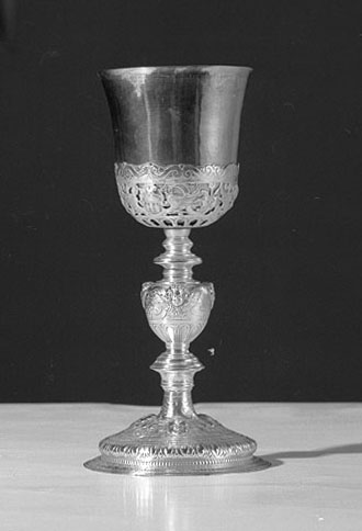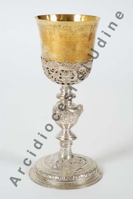 Il calice presenta piede circolare con bordo a fogliette e corpo leggermente bombato decorato da testine di cherubino alternate a festoni di frutta e da nastri formanti volute. Gli stessi motivi sono riproposti sul nodo a oliva schiacciata del fusto e nella sottocoppa traforata, dove ad essi si unisce una corolla di petali, traforati nel secondo caso.