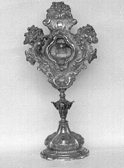 Il reliquiario presenta piede sagomato mistilineo con bordo gradinato e corpo bombato suddiviso da nervature in spicchi entro i quali si alternano teste di cherubino e motivi fitomorfi. Il nodo sagomato del fusto, anch'esso percorso da nervature è decorato da foglie incise e aggettanti. Il ricettacolo sagomato, con teca centrale mistilinea finemente incisa anche sul retro, è profilato da volute ricoperte di fiori.