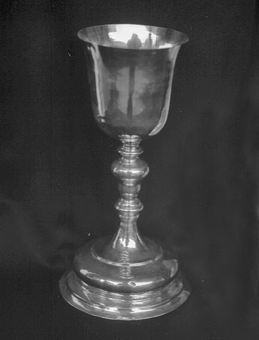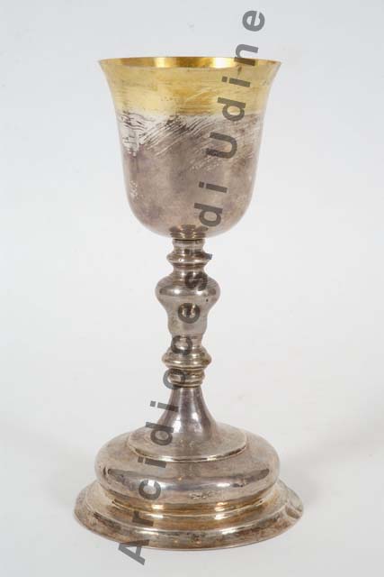 Il calice presenta piede circolare, con bordo gradinato e corpo bombato lisci, fusto con nodo piriforme percorso da circonferenze incise, coppa è svasata dorata all'interno e lungo il bordo esterno.