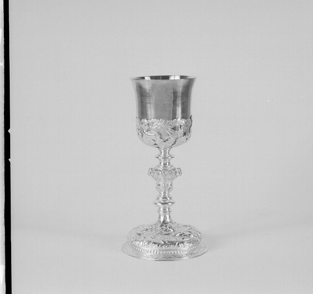Il calice presenta base bombata decorata a sbalzo con motivi vegetali e angioletti recanti alcuni simboli della passione di Cristo, su cui si imposta il nodo a sezione triangolare con testine di cherubino sporgenti e, alla base, un motivo di foglie disposte a corolla. La sottocoppa traforata ripropone gli stessi motivi decorativi della base. La coppa liscia ha il labbro leggermente espanso.