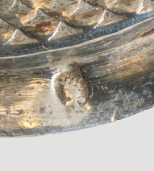 Base leggermente polilobata decorata a cesello con i simboli della passione alternati a grappoli d'uva. Un anello decorato a palmette separa la base dal nodo triangolare che reca su ogni faccia uno specchietto liscio. La sottocoppa è lavorata a giorno e riprende i motivi decorativi della base; la coppa liscia è dorata anche esternamente.