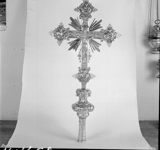 La croce presenta un'asta decorata con un motivo vegetale e il nodo, a due ordini, bacellato, con motivo floreale intercalato ad ovuli. Sul recto, al centro, è posto il Cristo a tutto tondo, sulle terminazioni trilobate dei bracci, sono sbalzate le immagini del Padre Eterno e di tre dottori della Chiesa. Sul verso, alle estremità sono raffigurati gli evangelisti con i loro simboli, al centro è posta sopra una testina d'angelo la Vergine con il Bambino. All'incrocio della croce e lungo i bordi, sono applicati i raggi e dei motivi vegetali a traforo che arricchiscono l`oggetto.