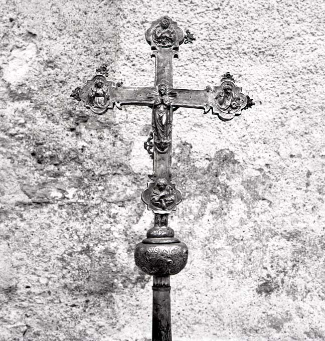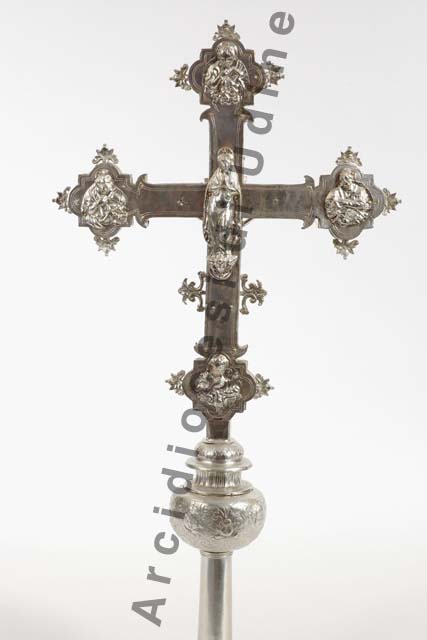 La croce presenta innesto liscio, seguito da un nodo sagomato con la parte inferiore a globo schiacciato decorata da testine di cherubino alternate a festoni di frutta con nastri formanti volute. I bracci, profilati da una doppia linea incisa e lisci, hanno terminazioni a compasso mistilineo precedute da semilune e ornate all'esteno dall'applicazione di fregi a giorno con cherubini su volute affrontate. Analoghi fregi, ma con motivi vegetali e di maggiori dimensioni, sono fissati anche a lato del montante. Sul recto la figuretta di Cristo, applicata su una croce più piccola con cartiglio, è circondata da busti raffiguranti Santa Maria Maddalena in basso, la Madonna e San Giovanni evangelista dolenti ai lati, Dio Padre benedicente in alto. Al centro del verso è posta la Madonna, stante su una testa di cherubino e con le mani giunte, intorno alla quale si dispongono gli evangelisti accompagnati dai relativi simboli: San Giovanni con l'aquila in basso, San Marco con il leone a sinistra, San Luca con il bue a destra e San Matteo con l’angelo in alto. Lo spessore della è percorso da girali vegetali fioriti.