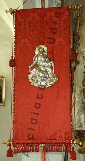 La placca raffigura la Madonna della Cintura seduta su una nuvola punteggiata di testine di cherubino, con le braccia aperte e una cintura in ciascuna mano. Provvista di cinque ganci e un anello nella parte posteriore, l'immagine è fissata su uno stendardo in damasco di seta rossa (recente), montato su bastoni lignei terminanti con pomoli baccellati dorati.