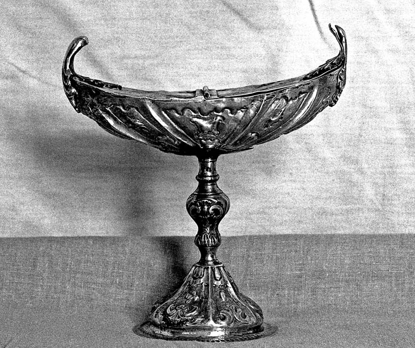 Il piede a sezione circolare presenta bordo piatto punzonato e corpo sagomato, suddiviso da sei costoloni in altrettanti spicchi che accolgono motivi di foglie e fiori stilizzati emergenti dal fondo puntinato. Analoga decorazione ricorre sul nodo sagomato del fusto, mentre sulla coppa a mezza luna otto constoloni obliqui scandiscono atrettante campiture con motivi geometrici in rilievo su fondo puntinato. Il coperchio è suddiviso in due parti, una delle quali apribile, provviste ciascuna di manici terminanti con una doppia foglia.