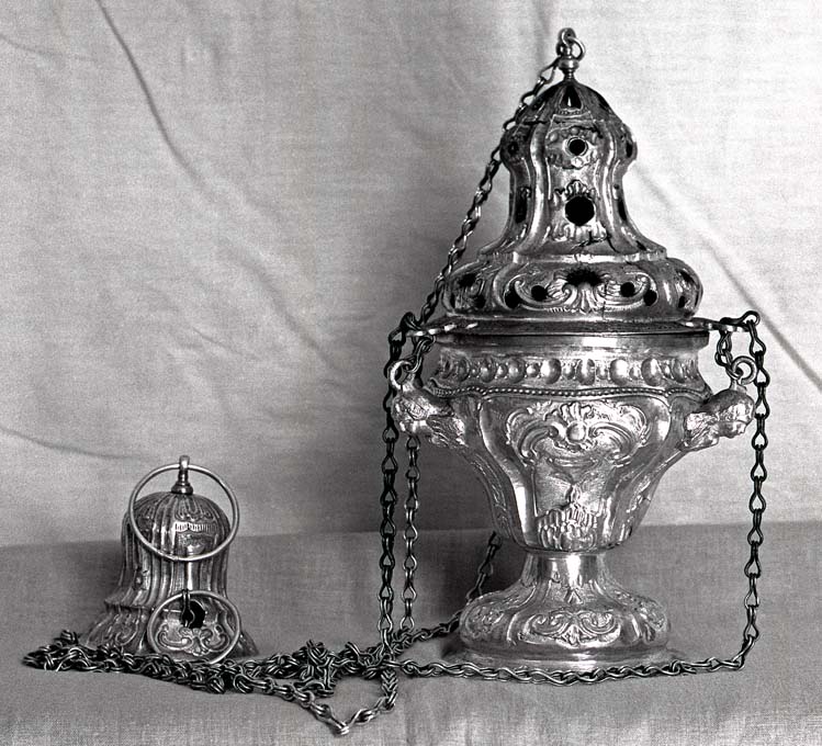 Il turibolo presenta base a sezione circolare, con bordo ornato da motivi geometrici e corpo bombato suddivisio da costoloni in sei spicchi, ciascuno dei quali accoglie motivi di foglie e fiori stilizzati emergenti dal fondo puntinato. Le nervature proseguono nel vaso, dove scandiscono grandi campiture con volute e motivi vegetali che si alternano ad altre di minori dimensioni, in corrispondenza delle quali sono applicate tre teste d'angelo, provviste di anelli per l'aggancio delle catenelle. Immediatamente sotto il bordo della coppa ricorre un motivo formato dall'alternarsi di ovali concavi grandi e piccoli; questi ultimi circondati da quattro puntini. Il coperchio sagomato e traforato è percorso anch'esso da nervature ed è contraddistinto da volute e motivi fitomorfi inglobanti fori per l'areazione delle braci. Sul bordo esterno, liscio e percorso da una circonferenza di puntini, in corrispondenza delle testine angeliche sottostanti sono fissate tre asole attraverso le quali passano le catenelle. Alla sommità del coperchio c'è un anello per la catenella minore. Il piattello a campanula, contraddistinto da una decorazione analoga alle altre parti, è provvisto di anello apicale.