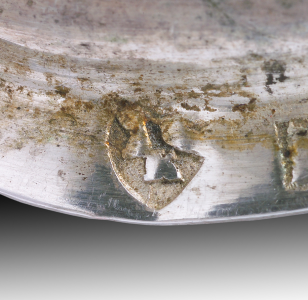 Il piede a profilo mistilineo, la cui superficie è suddivisa da nervature in rilievo, presenta una serie di modanature concave e convesse decorate a motivi fitomorfi e testine cherubiche. Su un primo nodo schaicciato a sezione ottagonale si innesta il nodo vero e proprio a sezione triangolare decorato a cartouches. La sottocoppa riccamente decorata a rilievo riprende i motivi del piede.