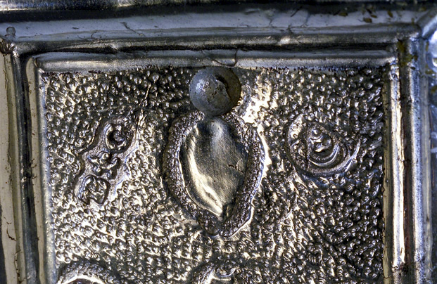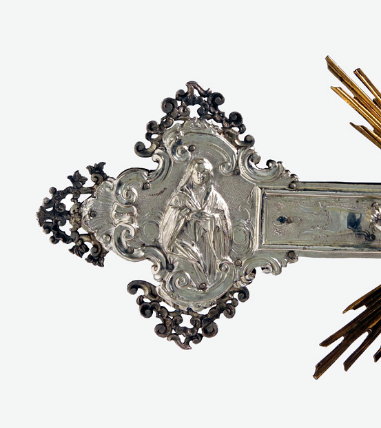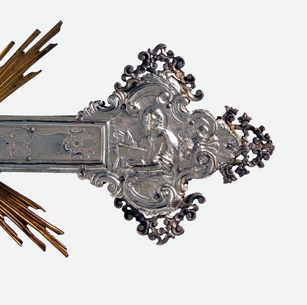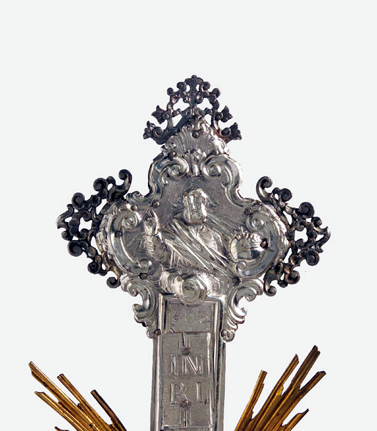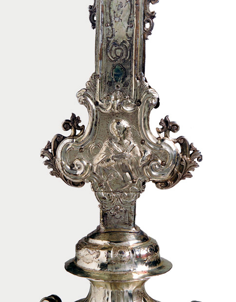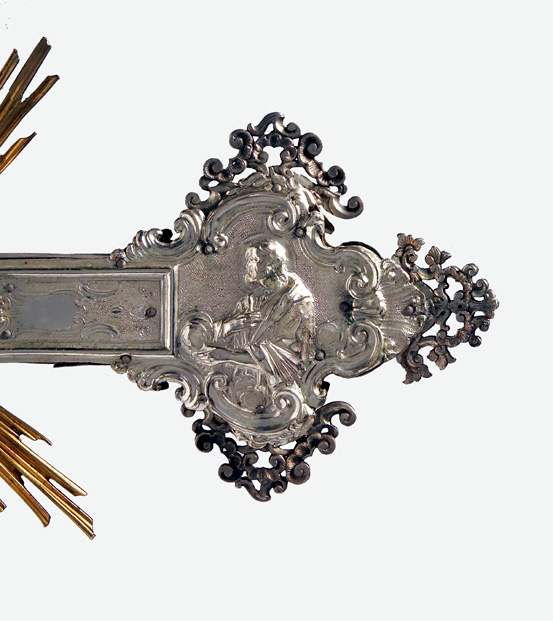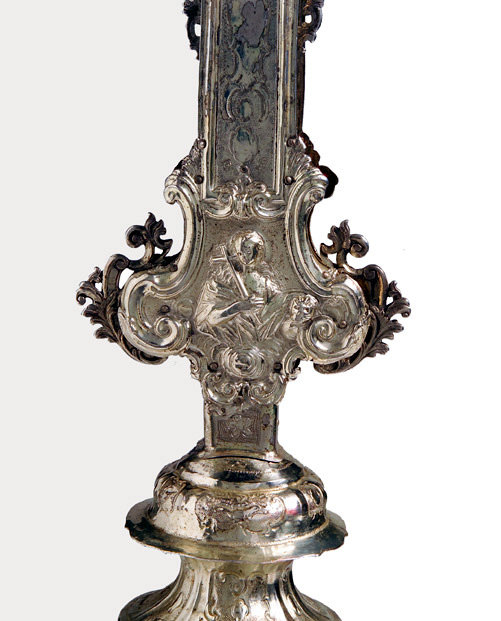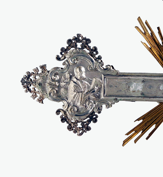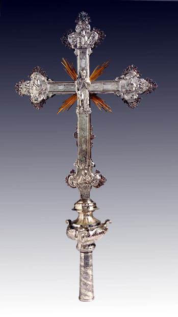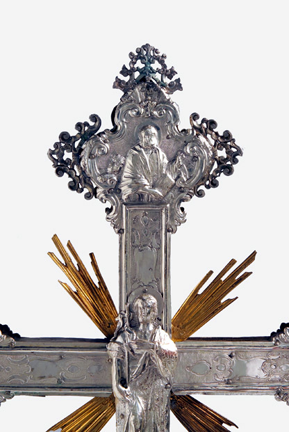 Su asta cilindrica ornata da una fascia a spirale con doppio decoro, s'innesta il nodo scandito da volute e foglie d'acanto aggettanti. La croce raggiata presenta estremità polilobate dal contorno mistilineo accentuato da applicazioni vegetali traforate. Sul recto presenta il Crocifisso con soprastante cartiglio, alle estremità, a sbalzo, sono raffigurati l'Eterno Padre, la Vergine, San Giuseppe e la Maddalena; sul verso, al centro, San Givanni Battista, alle estremità i simboli degli Evangelisti.