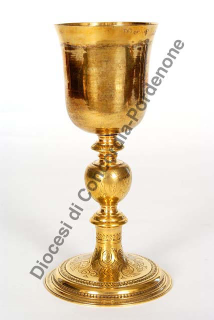 Presenta piede a base circolare ornato da fascia puntinata, da fascia a palmette stilizzate e da motivi fitomorfi incisi a bulino sul collo. Il fusto si caratterizza per gli elementi torniti e per il nodo a oliva decorato dai medesimi motivi fitomorfi del piede. La liscia coppa dorata ha orlo sporgente.