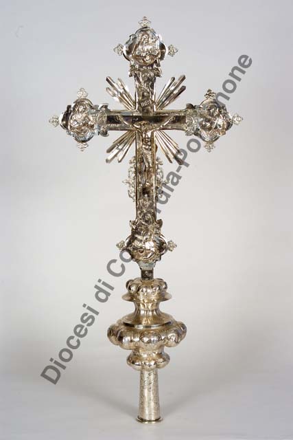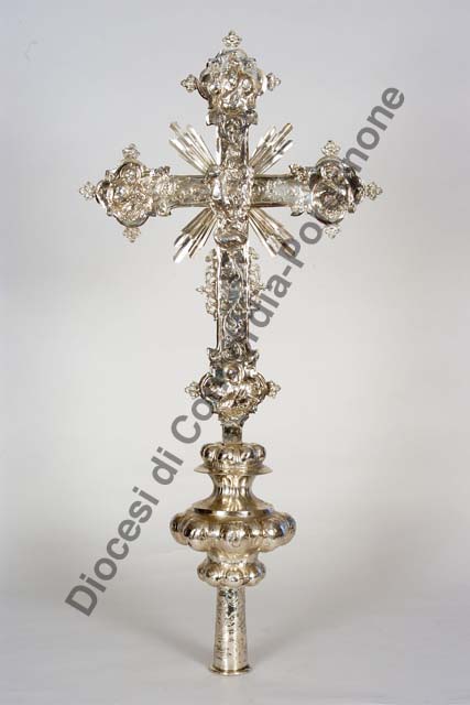 Innesto a tubo ornato da girali vegetali; nodo a due ordini baccellato conmotivi vegetali intercalati a ovoli. Sul recto, al centro, è posto il Cristo a tutto tondo, mentre sulle terminazioni trilobate sono collocati in alto l'evangelista Giovanni, in basso la Maddalena, a destra l'evangelista Matteo e a sinistra la Madonna. Sul verso è collocata al centro la figura di San Martino a cavallo che dona parte del mantello al povero, in alto l'Eterno Padre, in basso l'evangelista Luca, a sinistra San Marco e a destra l'evangelista Matteo. All'incrocio della croce e lungo i bordi sono applicati fasci di raggi lanceolati dorati e motivi a volute traforati, mentre motivi a traforo costituiti da testine cherubiche impreziosiscono le terminazioni. I bracci della croce sono decorati da motivo fogliare.